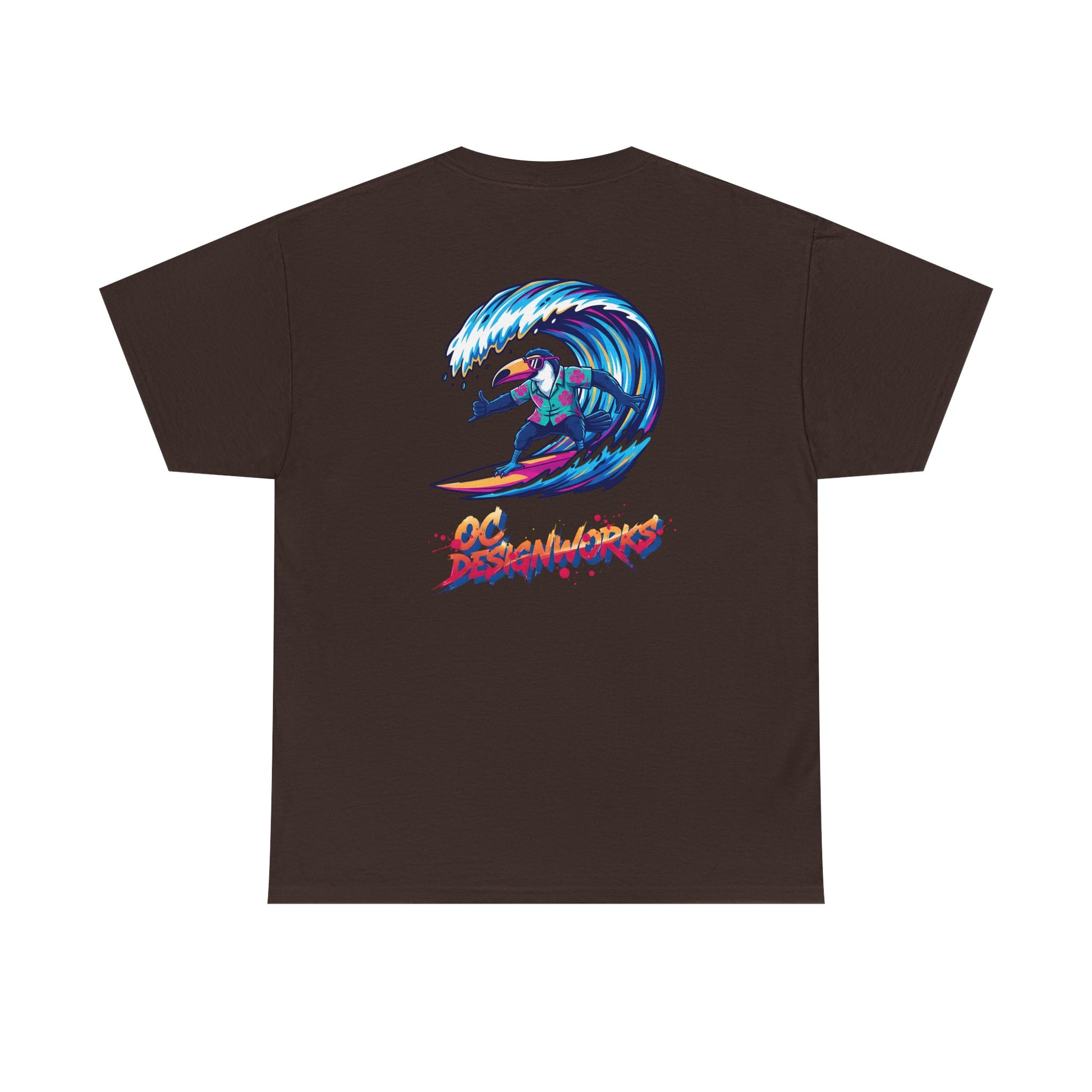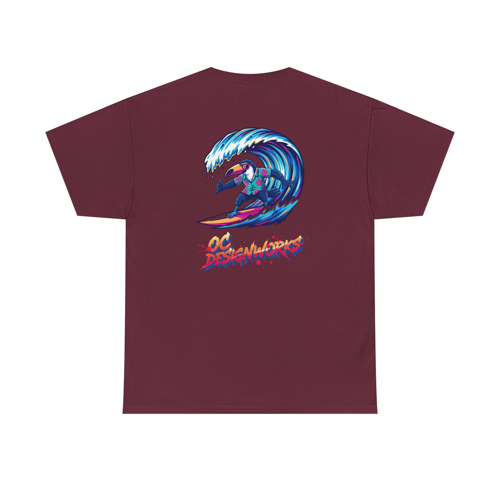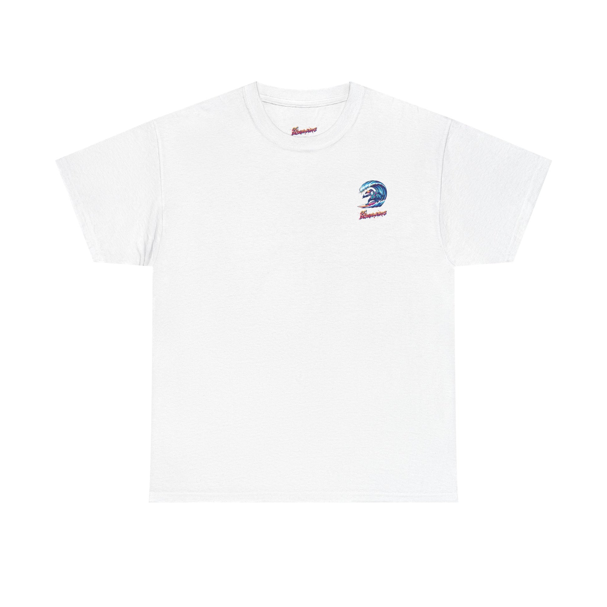 This lightweight, classic-fit tee brings sun-drenched afternoons and salt-spray optimism to everyday wear. A crisp white canvas showcases a colorful retro surf illustration: a stylized surfer carving inside a glassy blue wave on the back, with a small matching crest over the heart. The artwork’s vibrant, slightly grainy palette feels handcrafted — like a poster from a coastal boardwalk — while the soft, midweight cotton keeps things breathable from dawn patrol to late-afternoon bonfires. Wear it with faded denim, boardshorts, or layered under an open flannel for that easy, lived-in surf vibe that belongs to people who chase swell and stories in equal measure.
